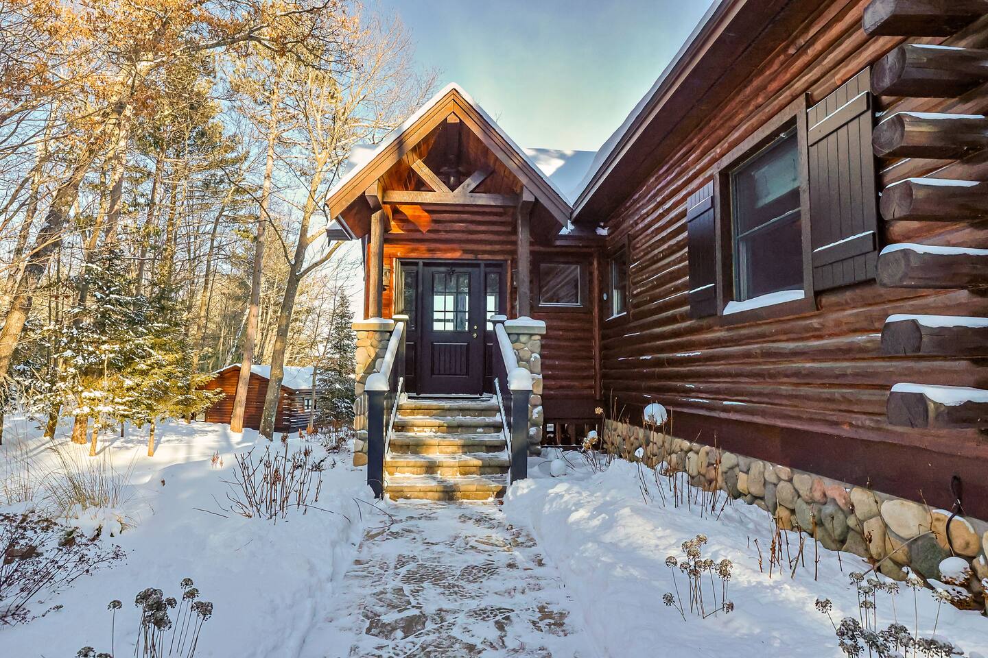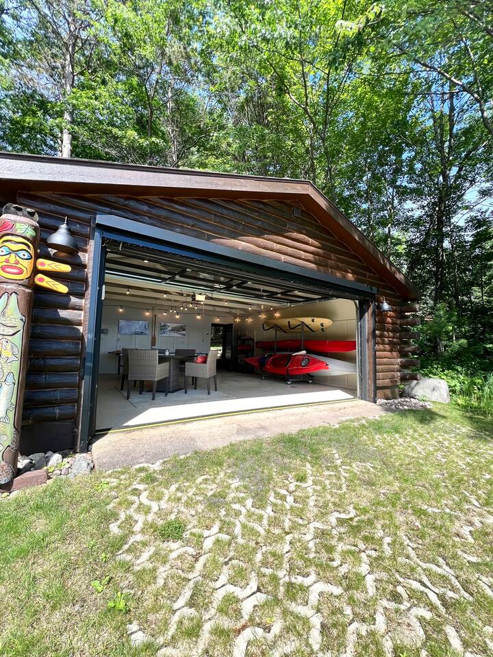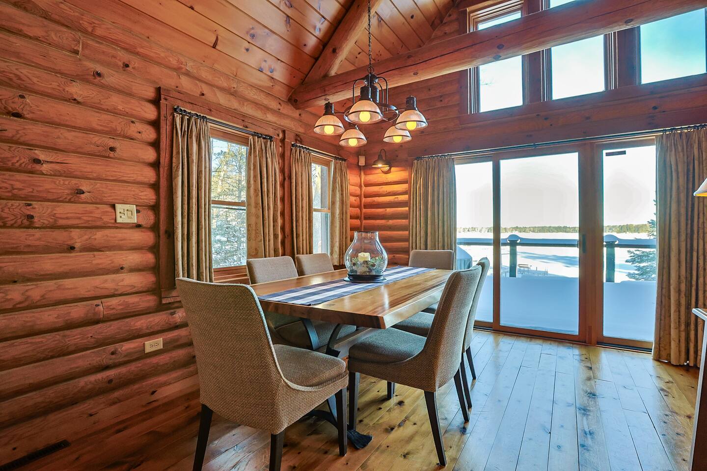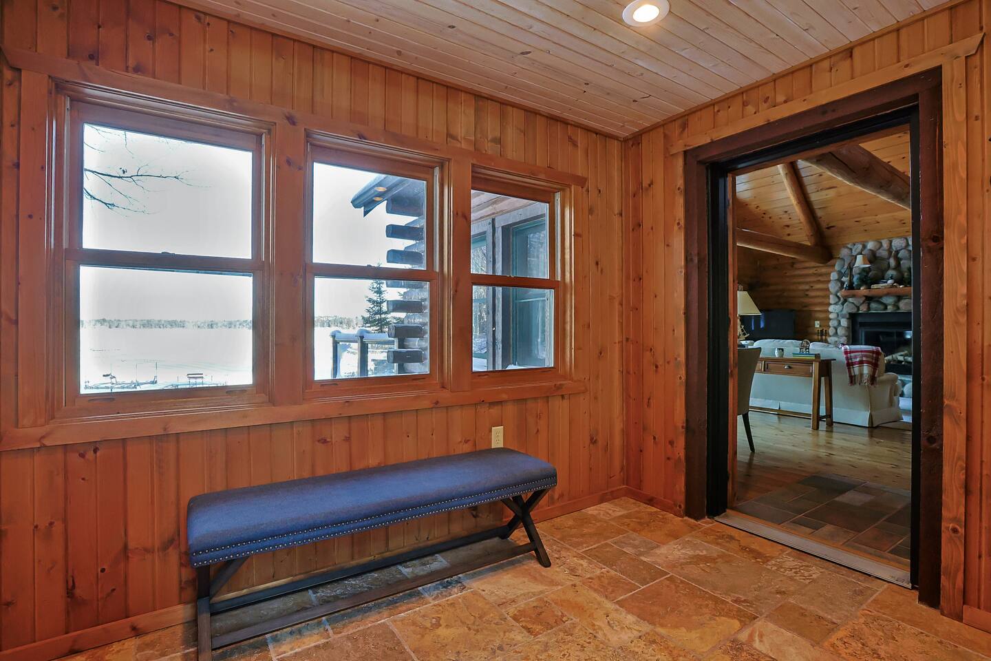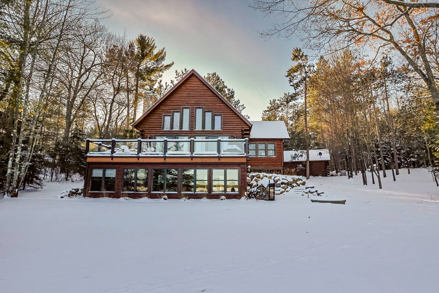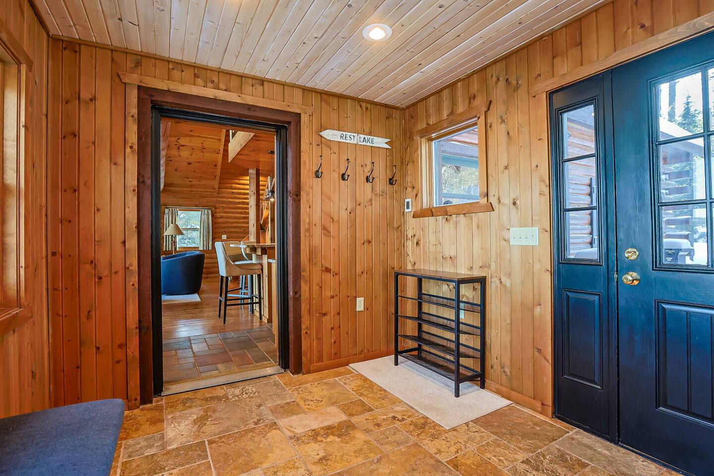 Rest Lake Retreat is one of the few places where you can capture serene woods and lake views, while being only seconds from restaurants, bars, grocery stores, and shops! Upon entering Rest Lake Retreat through the oversized mudroom, you will see high ceilings that showcase authentic log beams and a wall of windows facing the lake. In this main living area, there is a dining space, living room with a wood burning fireplace, and a kitchen with extra seating around the island. There are also two bedrooms and a full bathroom just down the hallway past the kitchen. The upstairs of this home holds the master suite. This lofted master suite has a sitting nook overlooking the main floor that boasts a stunning view of the lake, as well as a beautifully done full bathroom with shower. As you head downstairs, you will find another living space, additional bedroom, and a full bathroom. Attached to the downstairs, but separated off by a wall with glass door, is a fully finished, year-round, sitting area. This space offers you breathtaking views of the water, an enclosed office, and a door leading right to outside! Outside of Rest Lake Retreat, is a large lawn that leads right to Rest Lake. There is also a three-season dry boathouse that showcases it's proximity to the water through a glass garage door. Inside the boathouse is different seating options, and a ping-pong table. Just off the property, is access to miles of paved bike trails that can bring you to many bars, restaurants, and shops. For our winter guests, the snowmobile trail is just feet from the driveway, and there are many local cross country ski trails within minutes! We can't wait to have you at Rest Lake Retreat!
