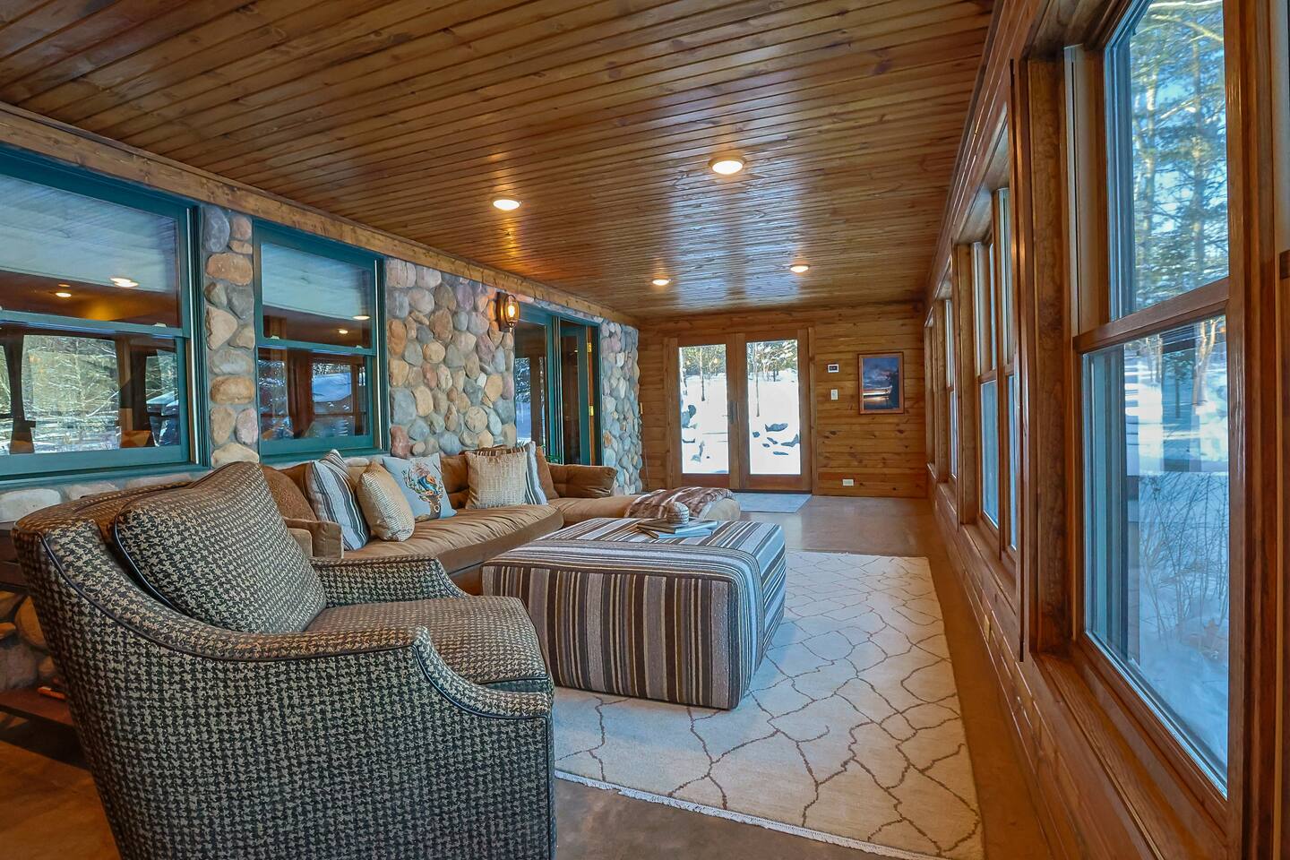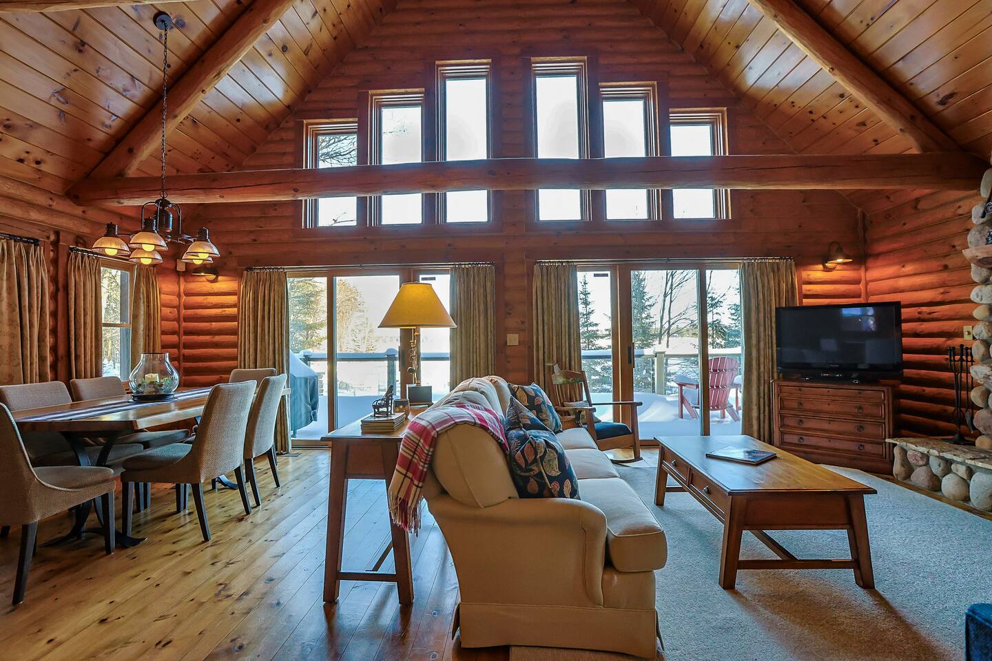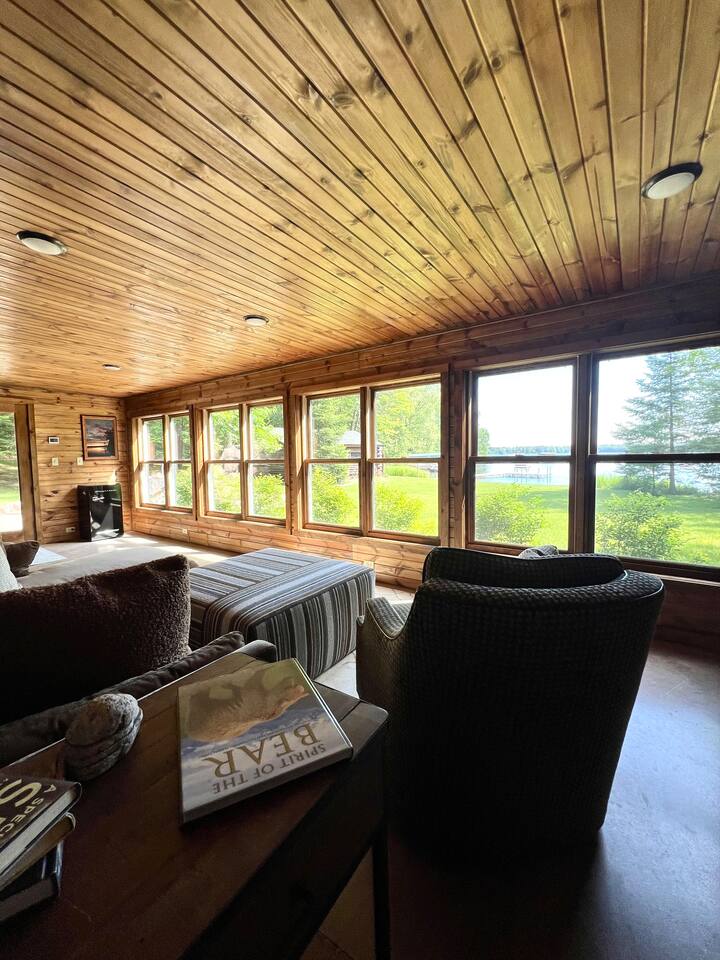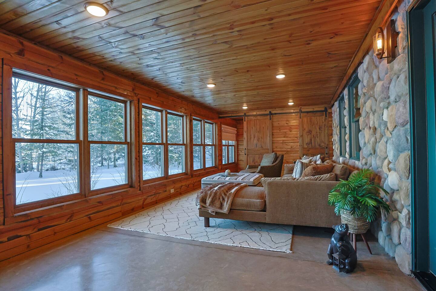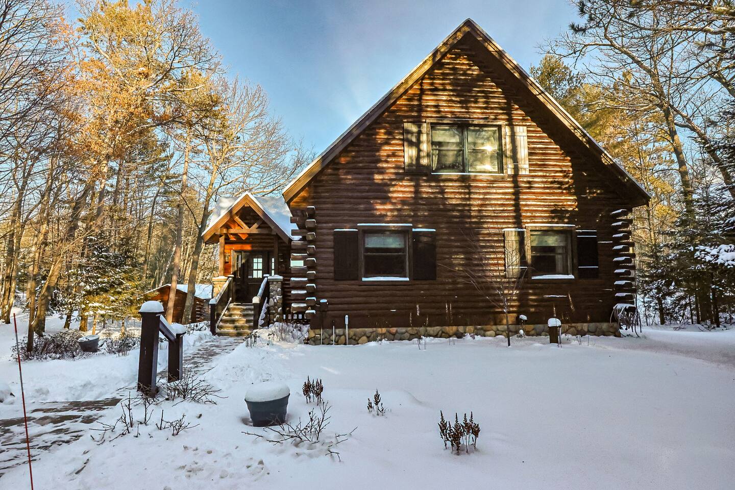 Rest Lake Retreat is one of the few places where you can capture serene woods and lake views, while being only seconds from restaurants, bars, grocery stores, and shops! Upon entering Rest Lake Retreat through the oversized mudroom, you will see high ceilings that showcase authentic log beams and a wall of windows facing the lake. In this main living area, there is a dining space, living room with a wood burning fireplace, and a kitchen with extra seating around the island. There are also two bedrooms and a full bathroom just down the hallway past the kitchen. The upstairs of this home holds the master suite. This lofted master suite has a sitting nook overlooking the main floor that boasts a stunning view of the lake, as well as a beautifully done full bathroom with shower. As you head downstairs, you will find another living space, additional bedroom, and a full bathroom. Attached to the downstairs, but separated off by a wall with glass door, is a fully finished, year-round, sitting area. This space offers you breathtaking views of the water, an enclosed office, and a door leading right to outside! Outside of Rest Lake Retreat, is a large lawn that leads right to Rest Lake. There is also a three-season dry boathouse that showcases it's proximity to the water through a glass garage door. Inside the boathouse is different seating options, and a ping-pong table. Just off the property, is access to miles of paved bike trails that can bring you to many bars, restaurants, and shops. For our winter guests, the snowmobile trail is just feet from the driveway, and there are many local cross country ski trails within minutes! We can't wait to have you at Rest Lake Retreat!