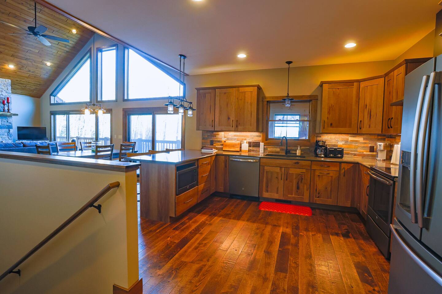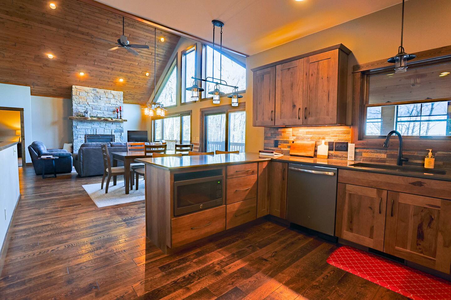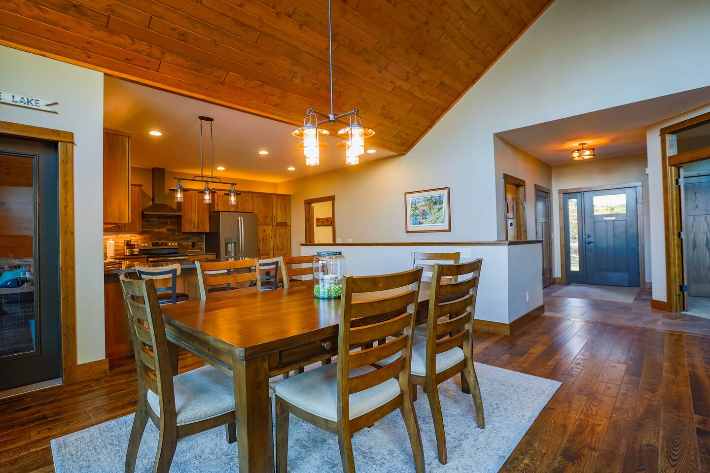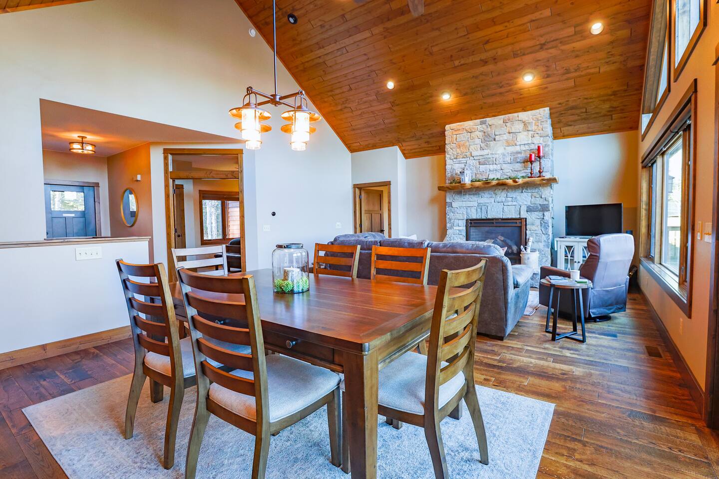 As you enter this newly built home, you are greeted by high ceilings, a cozy stone fireplace, and a wall of windows showcasing Papoose Lake! In the kitchen you will find modern appliances and a view out to the screen porch overlooking the lake. There is plenty of counterspace for food preparation and barstools to allow for helpful hands! Heading into the dining/living space, you are welcomed with a floor to ceiling stone fireplace, windows of similar length and different seating options to soak in the views. With an open concept design, you are able to gather as a whole group throughout the kitchen, dining room, and living area and comfortably catch up. Off the living space upstairs, you will find a full bathroom, cozy bedroom and the master bed/bath. Inside the master suite, there is a sliding door granting access to the deck that runs the length of the home. Across from the sliding door, you will see the entry to the master bath, where you will find a large tub looking out to the surrounding woods. There is also a stone shower and walk in closet. All together, giving you the perfect space to unwind! Downstairs, you will step into another living area that has a sliding door leading directly outside and plenty of games for the family to enjoy. There is an additional bedroom with an attached oversized bathroom downstairs as well. As you are heading outside, to the lake. There will be moderate gravel filled steps that transition to an easy-to-follow gravel path. Once down by the lake, you will welcome the tree filled horizon past the water. To gain a better view, you can step onto the dock with built in bench. There is also a heated attached garage for your use.